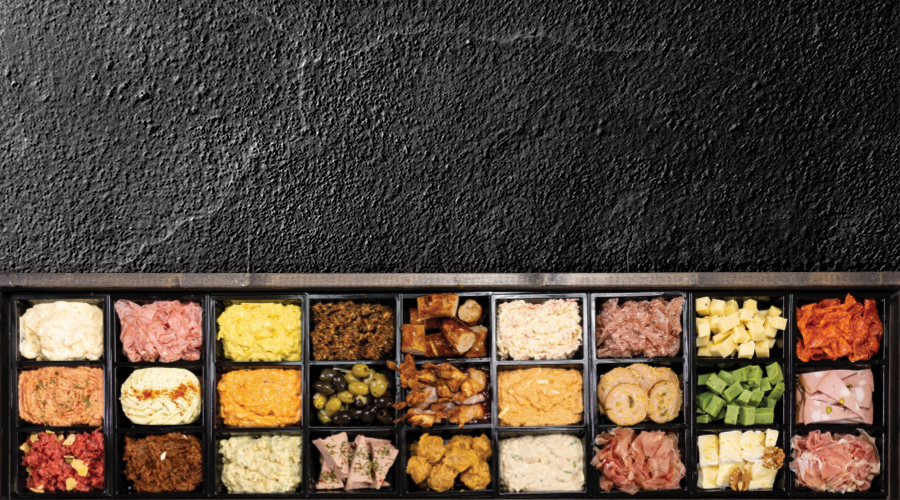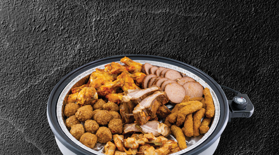 - Bestaand uit 6 soorten, bijvoorbeeld: kipkluifjes, grillworstjes, kipballetjes, spareribkluifjes, kipsateetjes en gehaktrolletjes.
